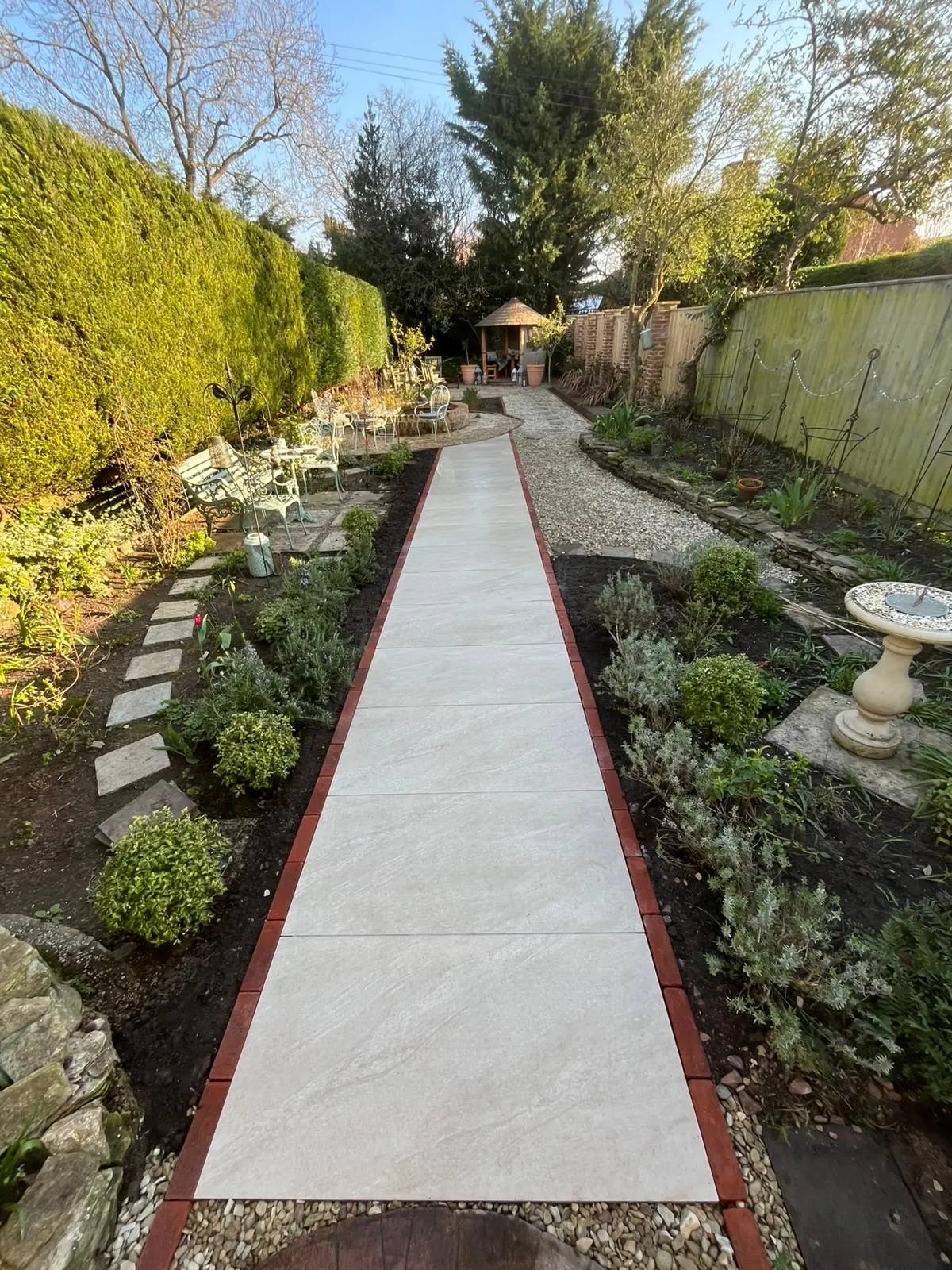 A complete garden overhaul in Cheltenham, transforming an overgrown, rat-infested space into a sleek, low-maintenance outdoor oasis with porcelain paving, integrated lighting, and a rat-proof brick wall.