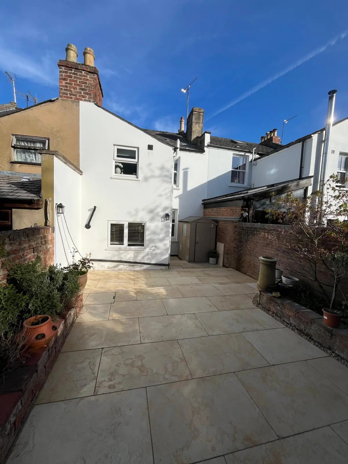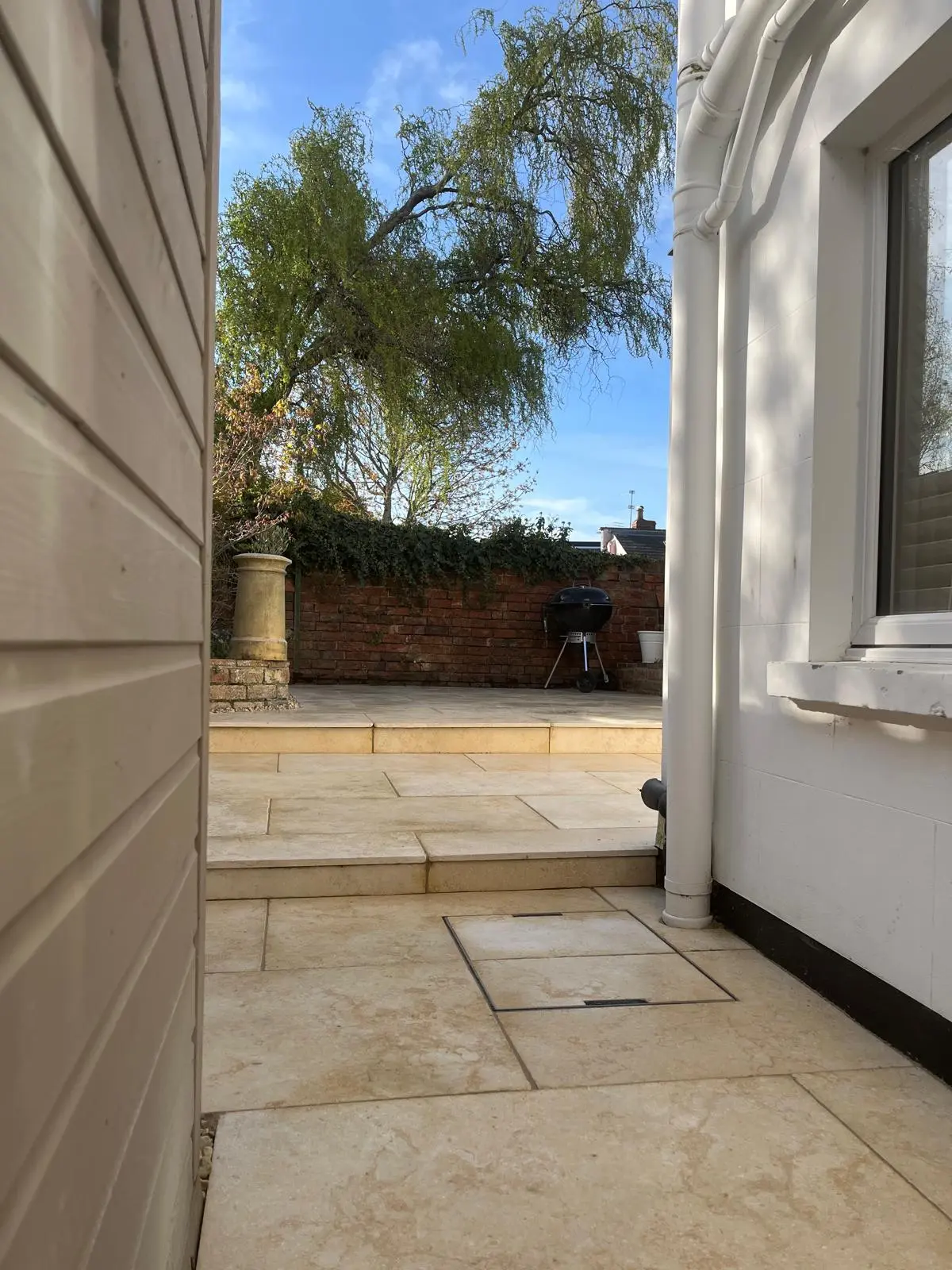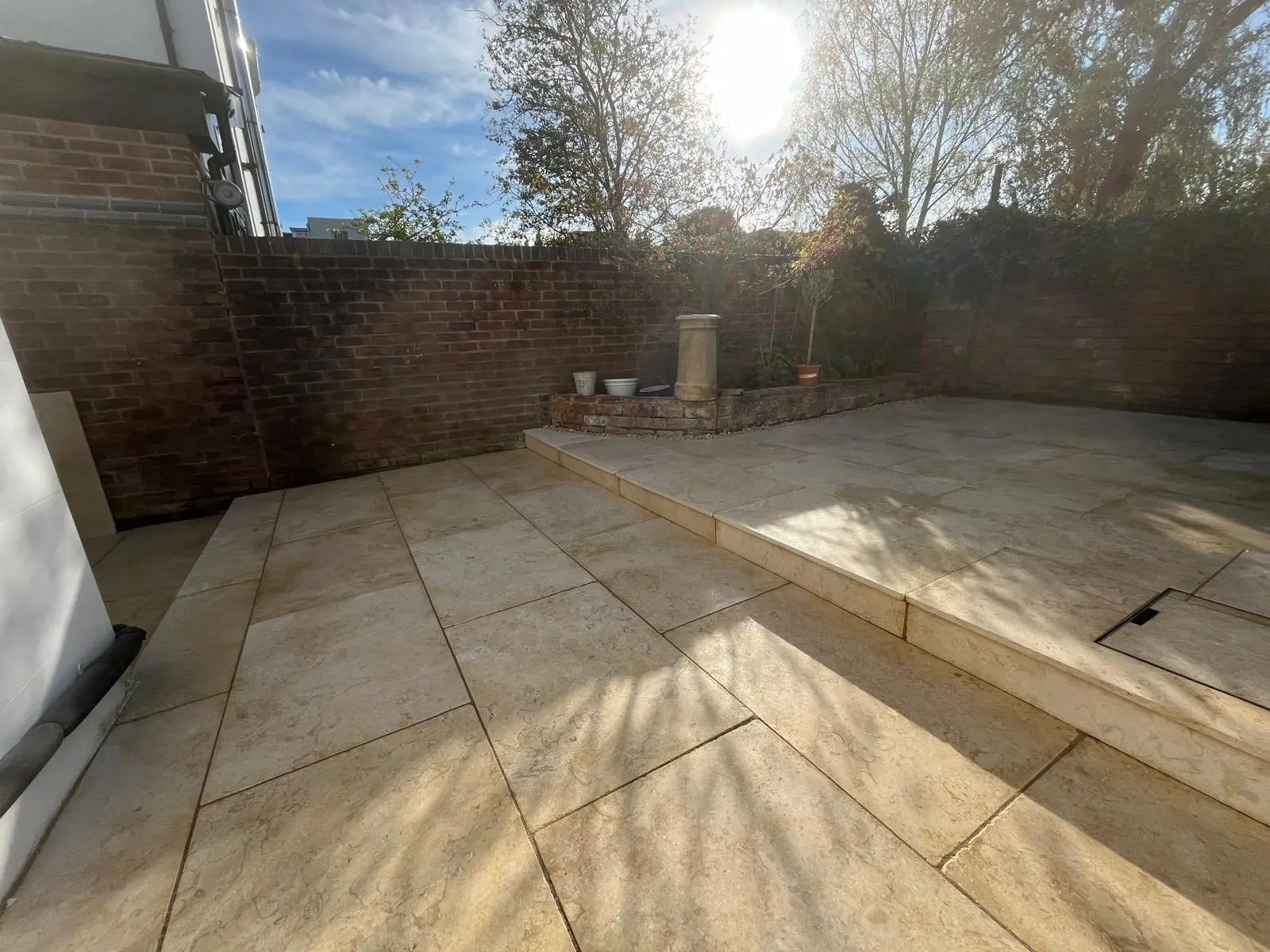 The finished garden is a complete transformation. The client chose beautiful limestone paving, which works perfectly with the clean lines and multi-level design. The addition of cladded steps and varied levels has completely changed the feel of the space, turning it into a modern, practical garden that feels significantly larger and far more inviting.